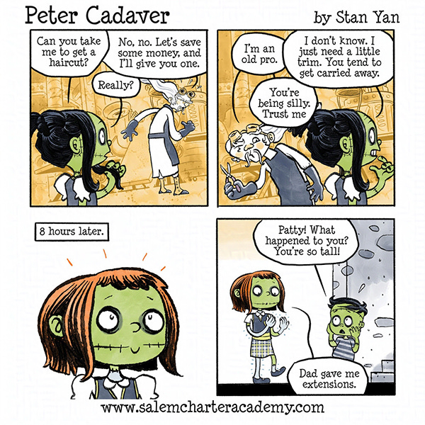 Comic description: Patty Cadaver asks her father, a mad scientist if he will take her to get a haircut. He says, “No, no let’s save some money, and I’ll give you one.” Patty says, “I don’t know I just need a little trim. You tend to get carried away.” Eight hours later. Patty has a light brown short haircut with bangs. Peter Cadaver screams and says, “Patty, what happened to you! You’re so tall.” Patty looks at her longer arms and legs and says, “Dad gave me extensions.”